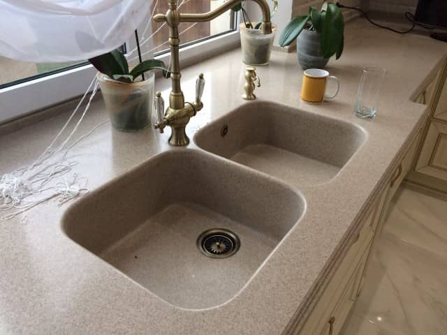 Столешница из камня с двойной мойкой для кухни